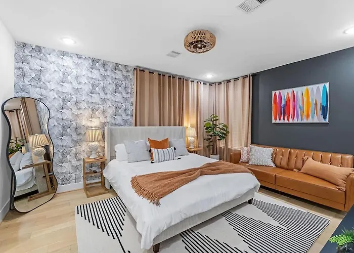 A pousada Downtown Oasis Rooftop With Skyline View dispõe de cozinha totalmente equipada com chaleira elétrica, utensílios de cozinha e artigos de vidro. Os hóspedes poderão desfrutar da cozinha Amerikaanse no Champ Burger, que fica a 650 metros de distância. O aeroporto em Houston Hobby está situado a 20 km da propriedade.